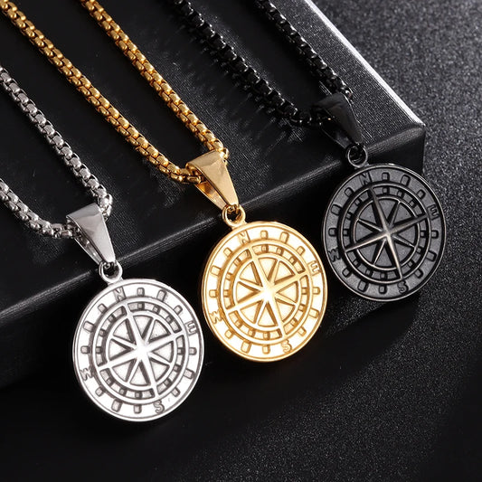 Vintage Compass Medal Pendant Stainless Steel Necklace Mens High Quality round Hip Hop Trend Jewelry Gifts Wholesale